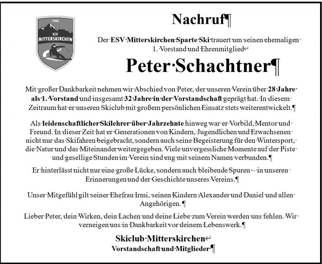 Der gesamte Verein trauert derzeit aufgrund des viel zu frühen Todes von unserem ehemaligen Vorstand und Ehrenvorstand Peter Schachtner! Wir bedanken uns für alles, was du für uns getan hast. Peter Ruhe in Frieden und wir sehen uns wieder!
