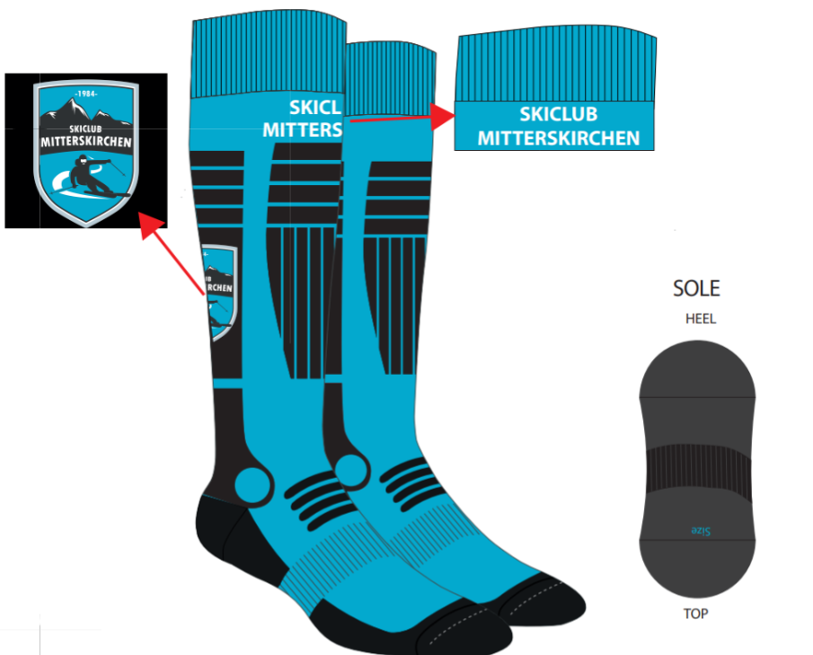 Ski-Socken im Design des Skiclub Mitterskirchen sind derzeit verfügbar in den Größen „31-34“, „35-38“, „39-42“ und „43-36“.