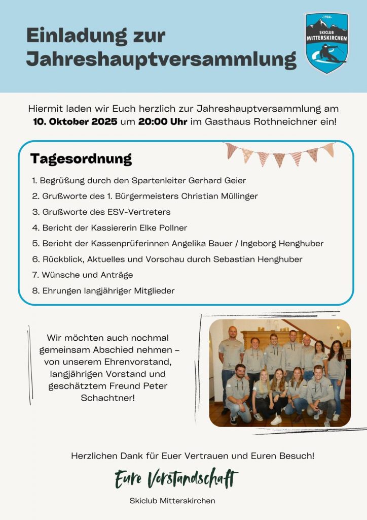 Hiermit laden wir euch herzlich zur Jahreshauptversammlung am 10.10.2025 um 20.00 Uhr im Gasthaus Rothneichner ein!
